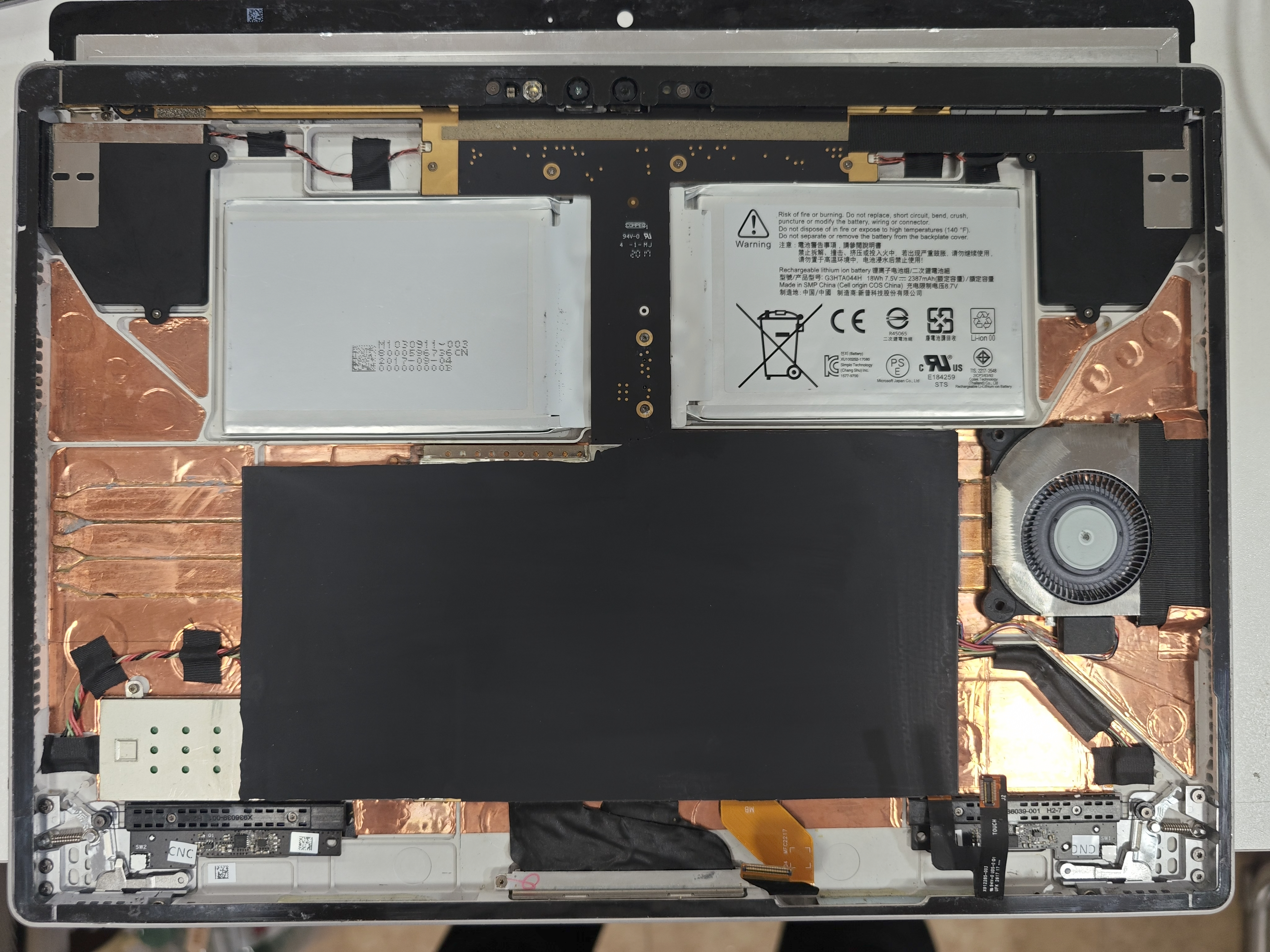 底座(键盘部分) 的盖板用同一套路就好拆多了,比屏幕省心一大截。拆开一看,底座里的电池似乎早就被前任机主动过手脚——算是省了一道工序。