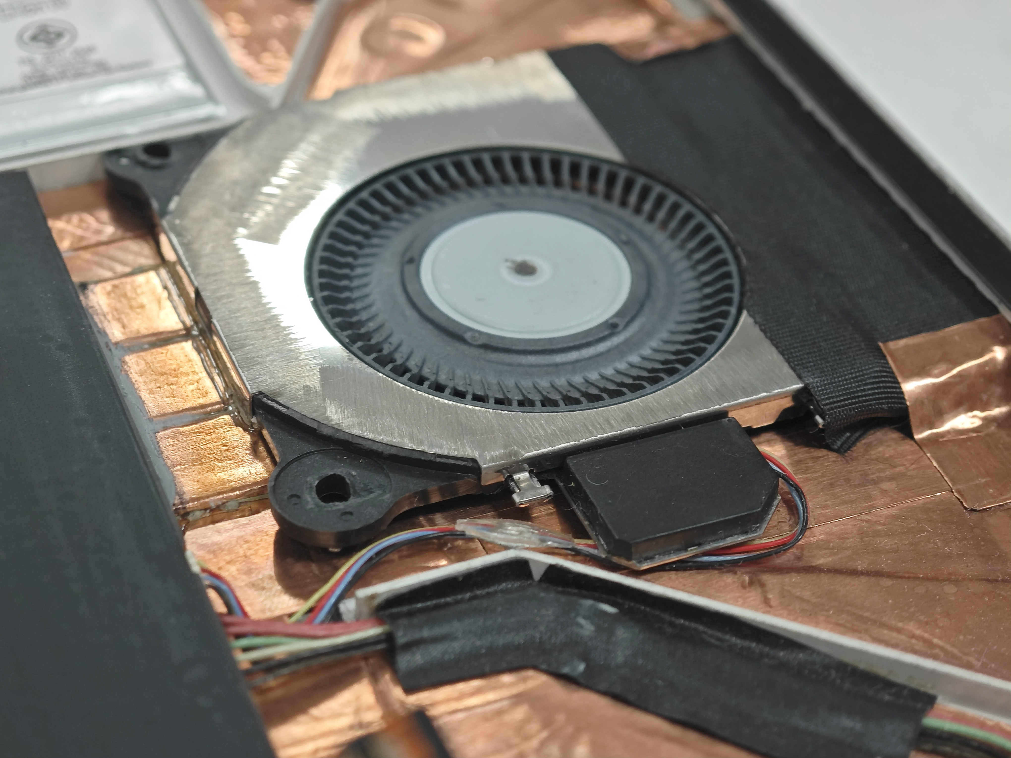 风扇外壳需要 稍微打磨 才能卡进预留空间。出风口位置用胶带先把鳍片固定住,再用硅脂 + 胶把鳍片、风扇和均热管连成一条导热链路。